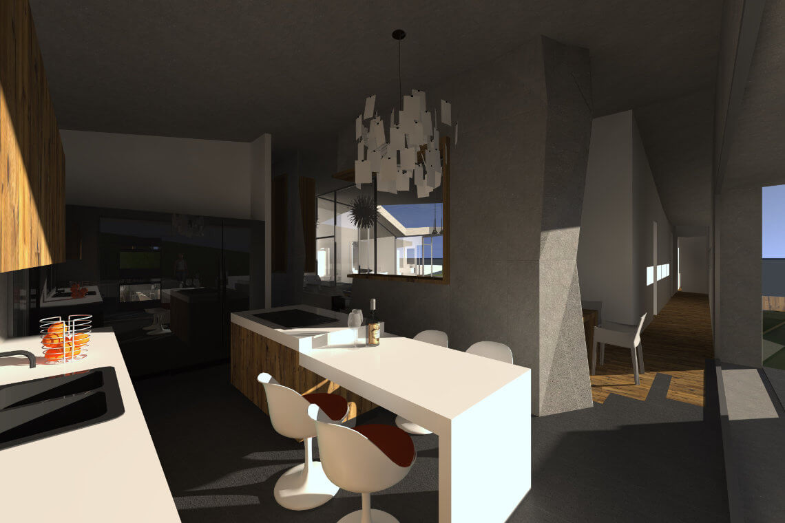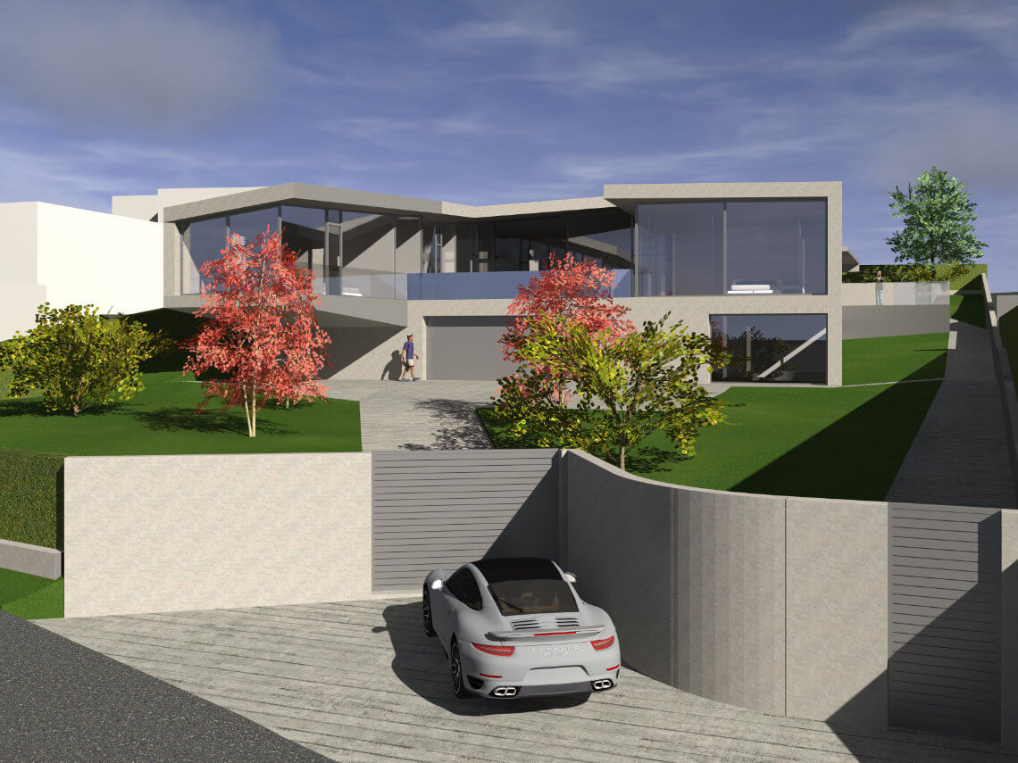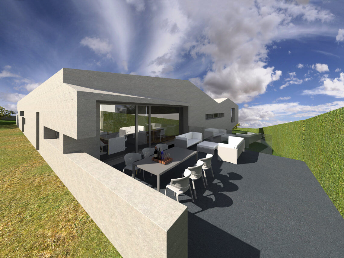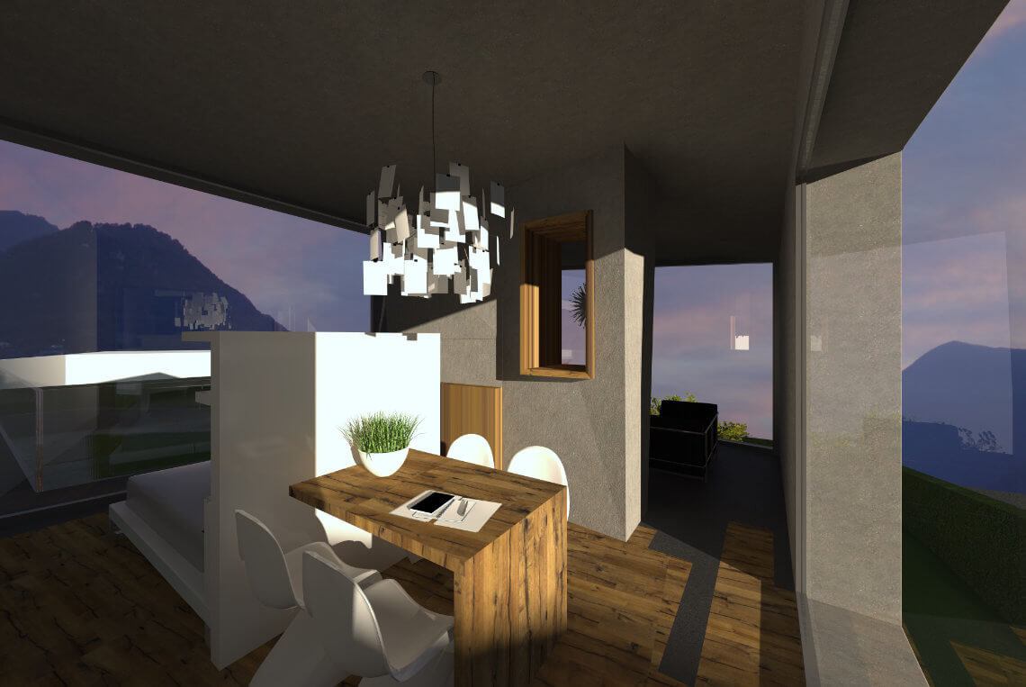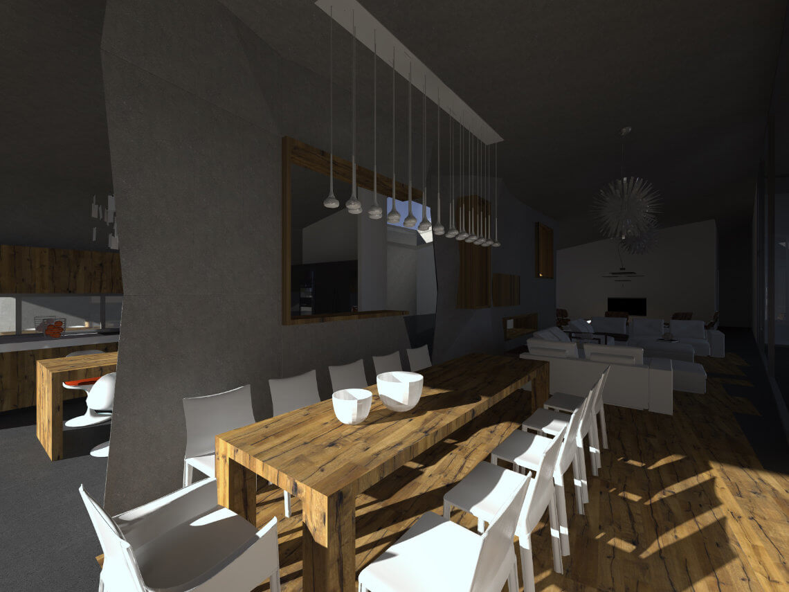 In the middle of the mountains, and surrounded by other constructions, this house is developed around its central court, that provides light and best views. On the other hand, the outer perimeter is closed, just with certain windows to permit some views and to accentuate the massive aspect of the concrete façade. The roof is faceted as the surrounding mountains.